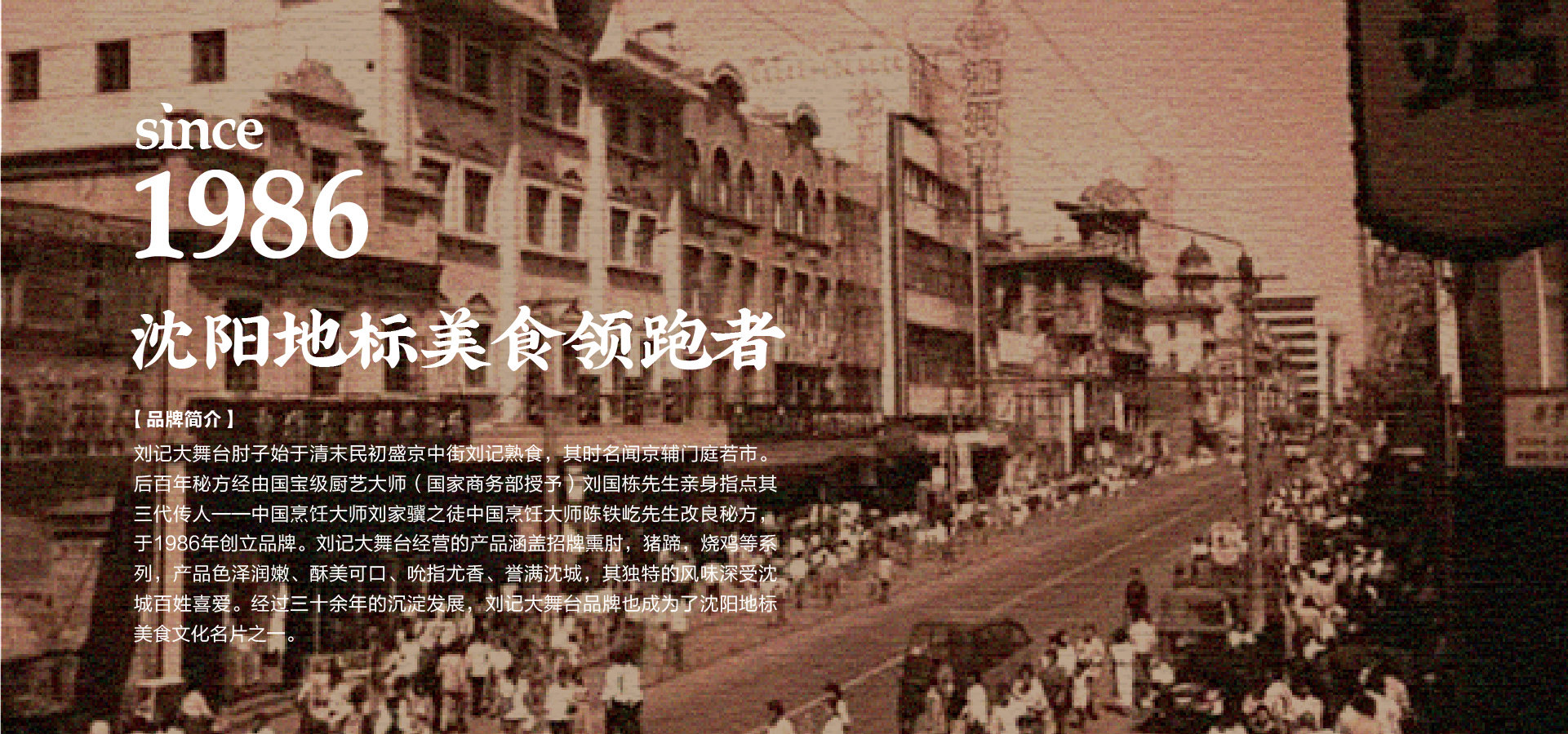 品牌創始人陳鐵屹先生自幼師承遼菜正宗,以發揚傳承遼味為己任。1986年,陳鐵屹先生經師傅指導調制出第一鍋醬湯,自此開始制作熟食,并于市井銷售,食客絡繹不絕。作為中華美食的傳承者、開拓者和創新者,陳鐵屹先生于80年代創立“劉記大舞臺肘子”品牌,開出了第一家門店?;诎倌昝胤絺鞒懈牧?,并采用新鮮放心原料,秘用二十幾味名貴藥材,延用傳統工藝專心加工而成,形成了色澤艷麗,酥爛脫骨,肥而不膩,瘦而不柴的風味產品。